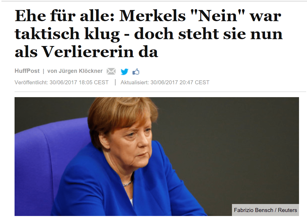 wenn Populismus das schamlose Ausnutzen von launigen Stimmungen ist, dann sind Sie die Königin des Macht-Populismus. Eiskalt rechnen Sie damit, dass die wenigen wertkonservativen die vielen linksliberalen Wählerstimmen nicht aufwiegen würden. So haben Sie also die ‚Ehe für alle‘ kurz vor dem Sommerloch zugelassen, damit Ihr Wahlsieg ungefährdet ist.