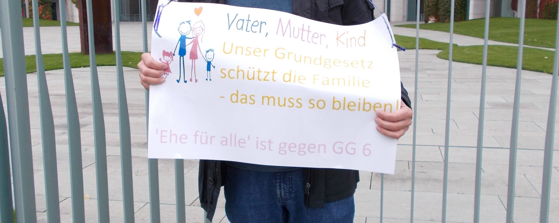 Am Samstag vor 16 Tagen war es soweit: ich schaute Interim-Bundeskanzlerin Angela Merkel ins Angesicht. Oder noch besser: sie konnte mir auf den Popo schauen, da ich am Zaun vor dem Bundeskanzleramt meine allererste Mahnwache hielt: für Ehe und Familie nach Artikel 6 des Grundgesetze – gegen die ‚Ehe für alle‘!