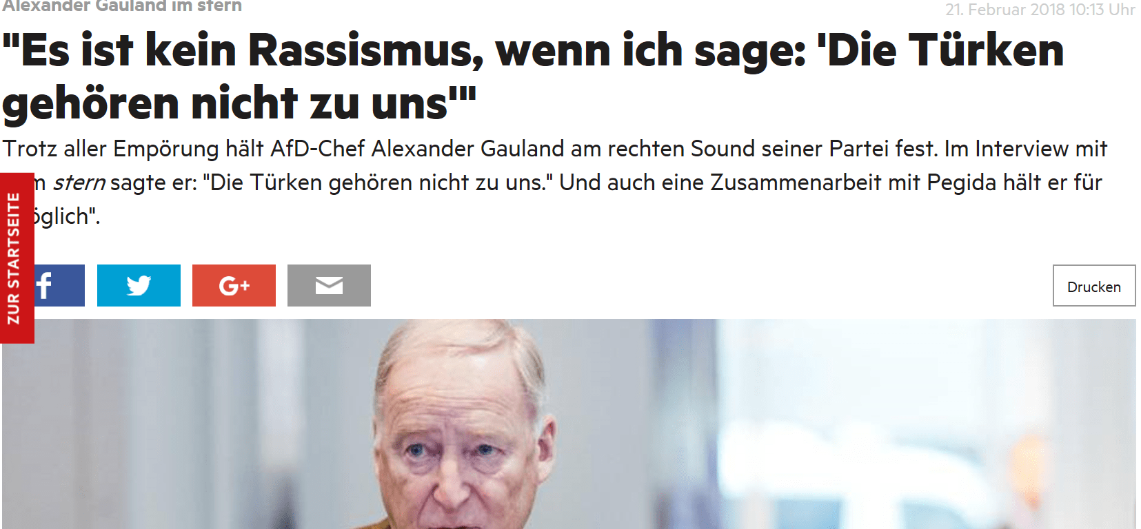 Nein, Herr Gauland, das soll kein Rassismus sein? Was ist es dann, wenn Sie sagen, ‚die‘ -also alle – Türken gehören nicht zu Deutschland?