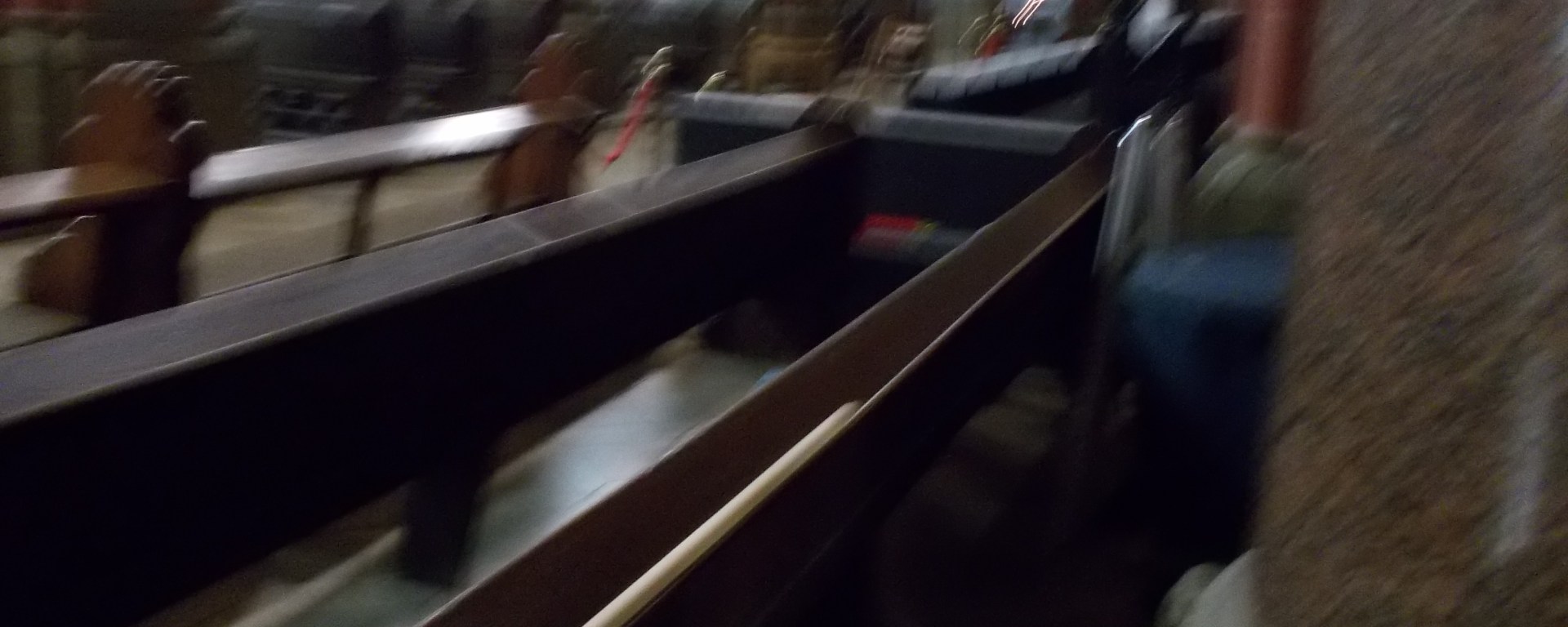 Etwas verwackelt aufgenommen (praktisch im Laufschritt, weil ich nicht wusste, ob es unerwünschte Folgen für mich haben könnte) sieht man die Aufschrift des Schildes ganz rechts etwas verwischt: „Heilige Beichte – am Chorpodest“.