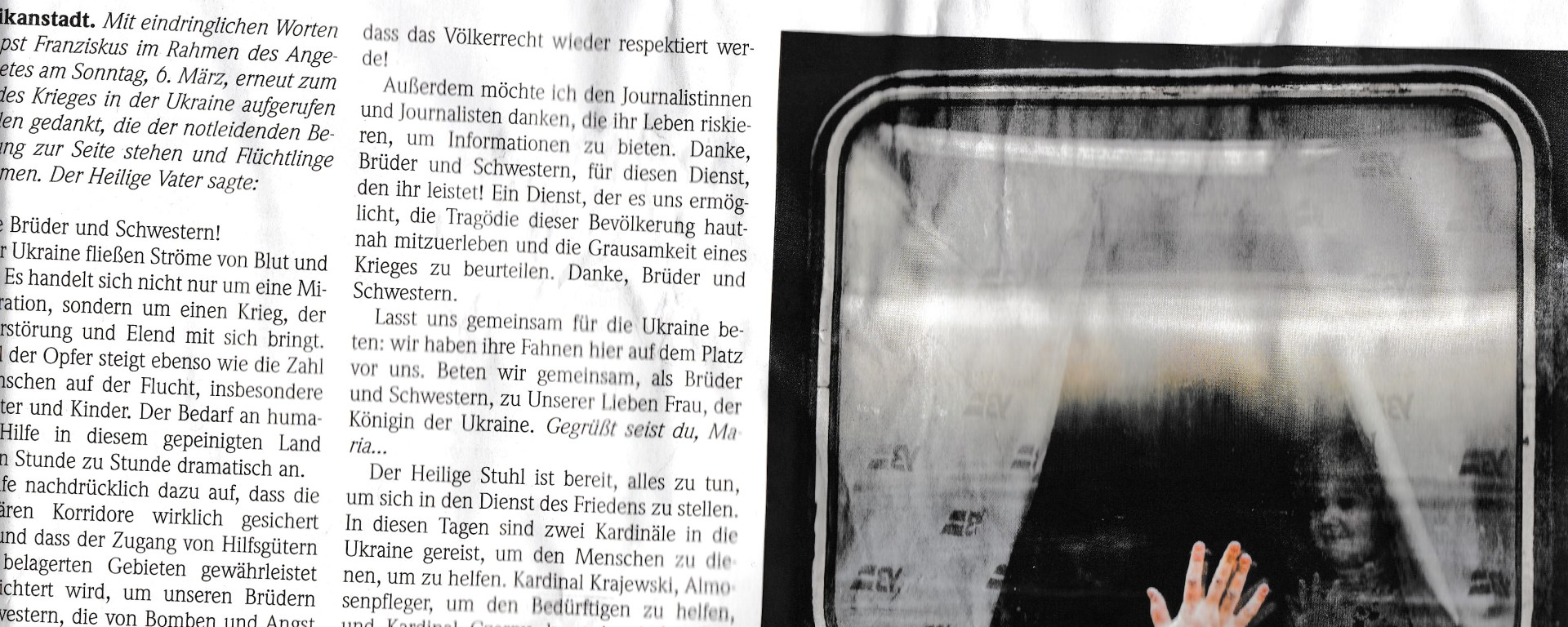 Beim Angelusgebet vom letzten Sonntag, 6.März 2022, sprach Papst Franziskus Klartext: „In der Ukraine fließen Ströme von Blut und Tränen. Es handelt sich nicht nur um eine Militäroperation, sondern um einen Krieg, der Tod, Zerstörung und Elend mit sich bringt. Die Zahl der Opfer steigt ebenso wie die Zahl der Menschen auf der Flucht, insbesondere der Mütter und Kinder. Der Bedarf an humanitärer Hilfe in diesem gepeinigten Land steigt von Stunde zu Stunde dramatisch an.“[1]