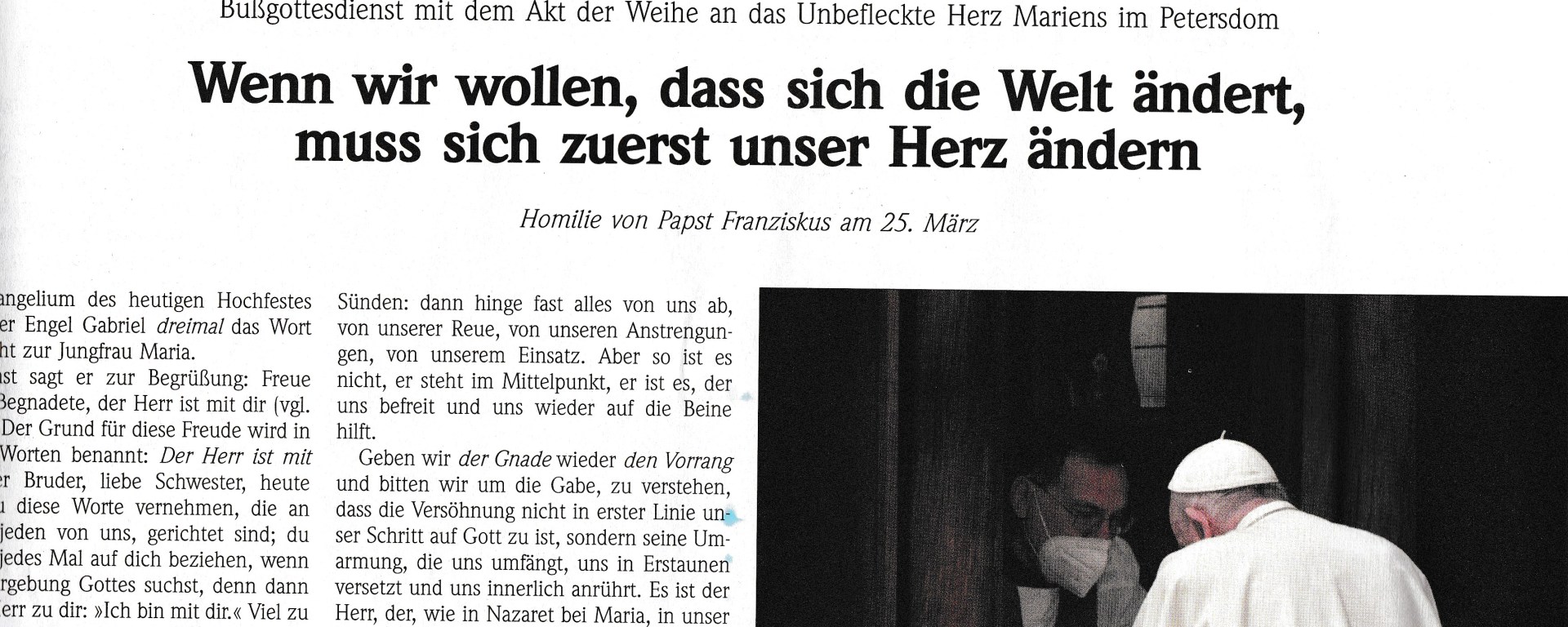 [2] Wenn wir wollen, dass sich die Welt ändert, muss sich zuerst unser Herz ändern – L’Osservatore Romano (abgerufen am 3.4.22).