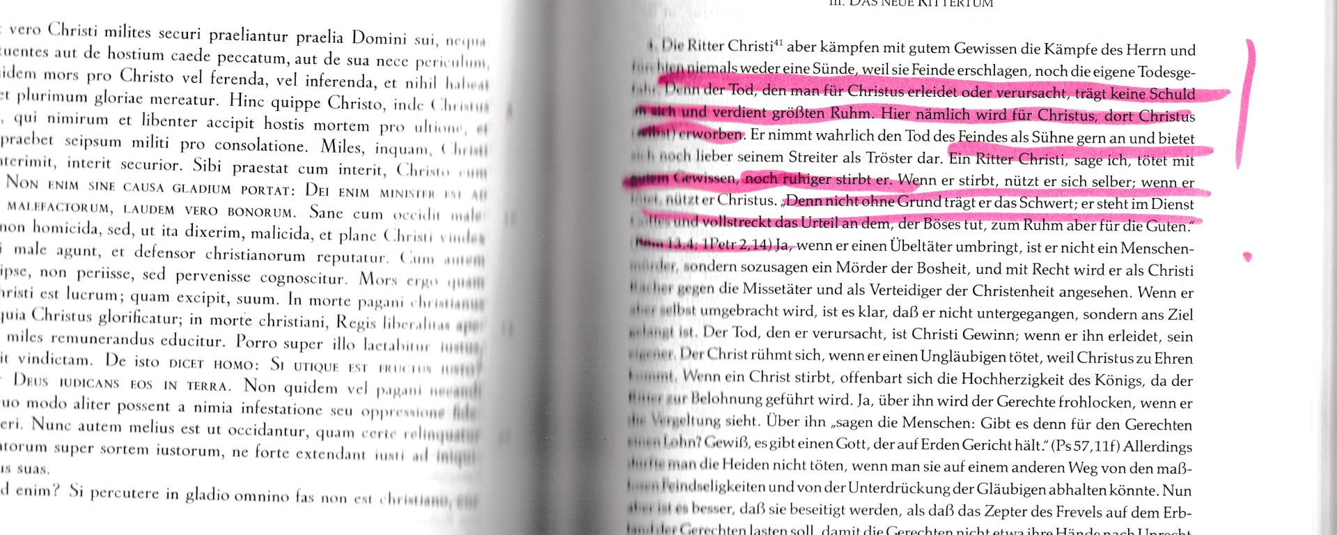 „Ein Ritter Christi, sage ich, tötet mit gutem Gewissen, noch ruhiger stirbt er. Wenn er stirbt, nützt er sich selber; wenn er tötet, nützt er Christus. ‚Denn nicht ohne Grund trägt er das Schwert; er steht im Dienst Gottes und vollstreckt das Urteil an dem, der Böses tut, zum Ruhm aber für die Guten.‘(Röm 13,4; 1 Petr 2,14) Ja, wenn er einen Übeltäter umbringt, ist er nicht ein Menschenmörder, sondern sozusagen ein Mörder der Bosheit, und mit Recht wird er als Christ Rächer gegen die Missetäter und als Verteidiger der Christenheit angesehen.“[1]