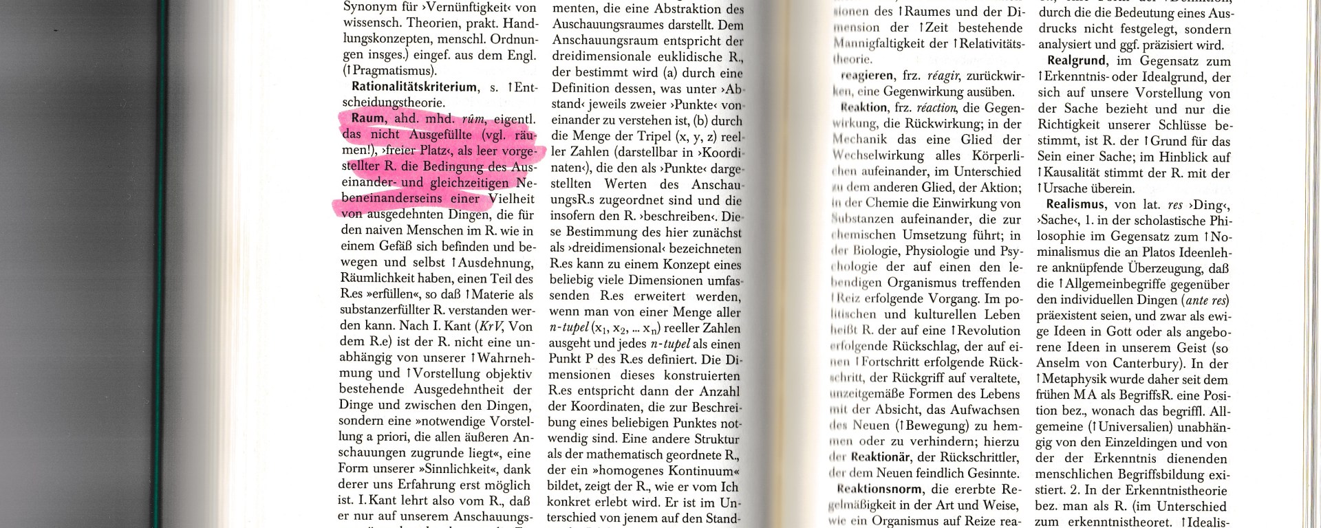 Laut meinem heiß geliebten ‚Wörterbuch der philosophischen Begriffe‘ von Johannes Hoffmeister (Hamburg 1998) ist der Raum „das nicht Ausgefüllte (vgl. räumen!), ‚freier Platz‘, als leer vorgestellter Raum“[1].
