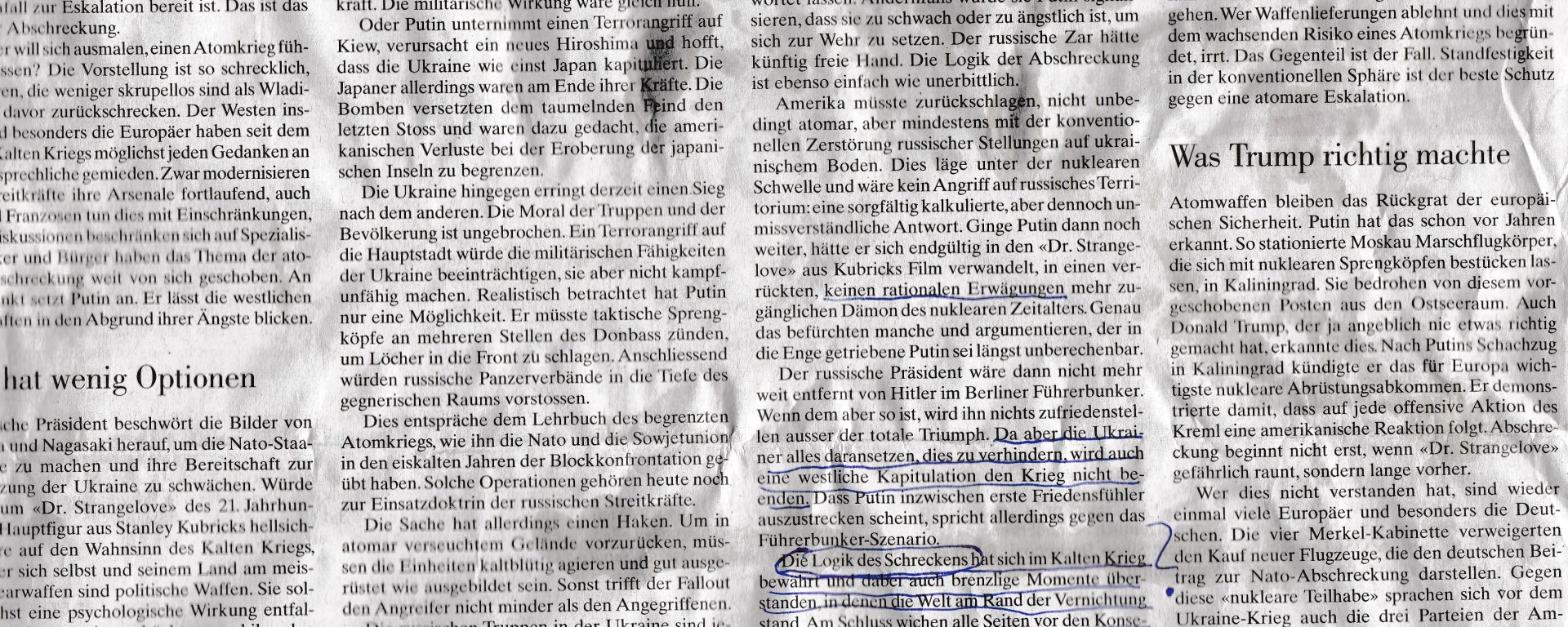 Der arme Leser darf buchstabieren: „Die Logik des Schreckens hat sich im Kalten Krieg bewährt und dabei auch brenzlige Momente überstanden, in denen die Welt am Rand der Vernichtung stand. Am Schluss wichen alle Seiten vor den Konsequenzen zurück. Eine glaubwürdige Abschreckung ist deshalb auch heute das beste Mittel, um den Einsatz von Atomwaffen zu unterbinden.“