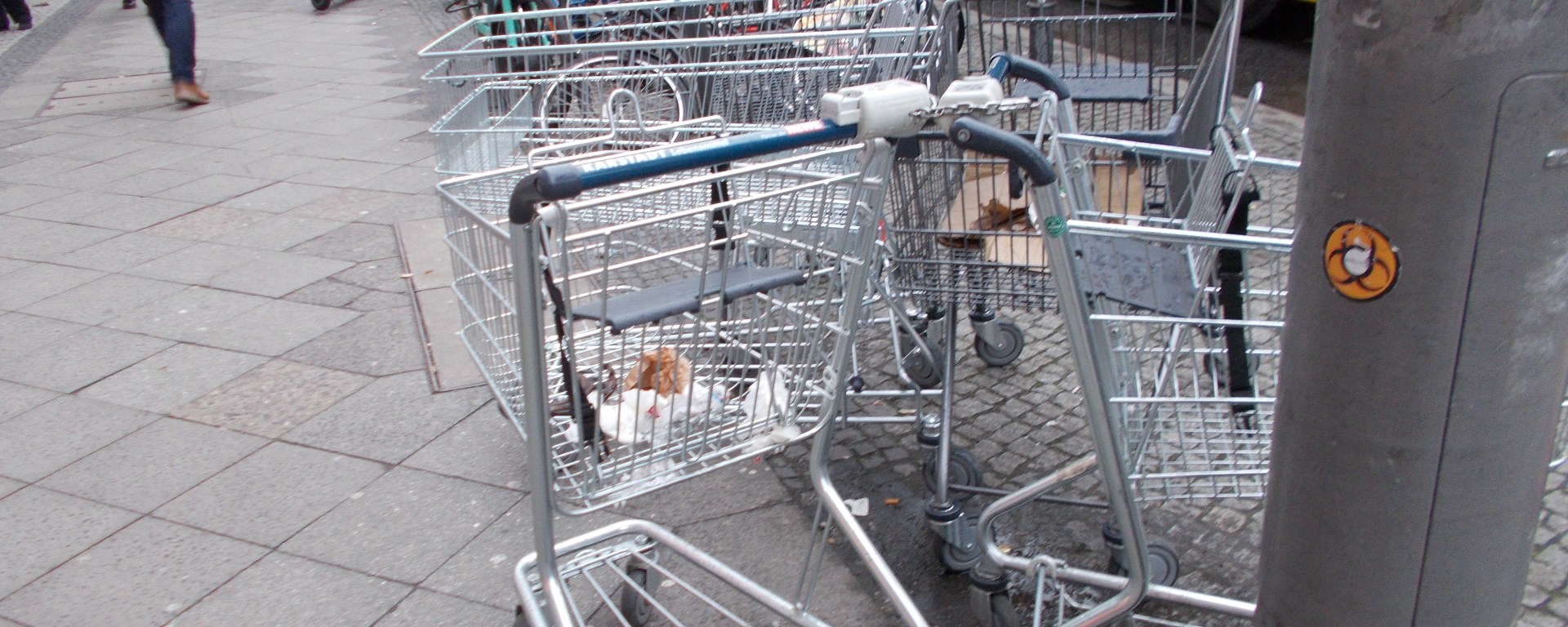 Die vielen Einkaufswagen stehen direkt vor der Ampel an der Autobahnbrücke, die quasi als Überdachung des Eingangs zur U-Bahnlinie 9 ‚Schlossstraße‘ dient.