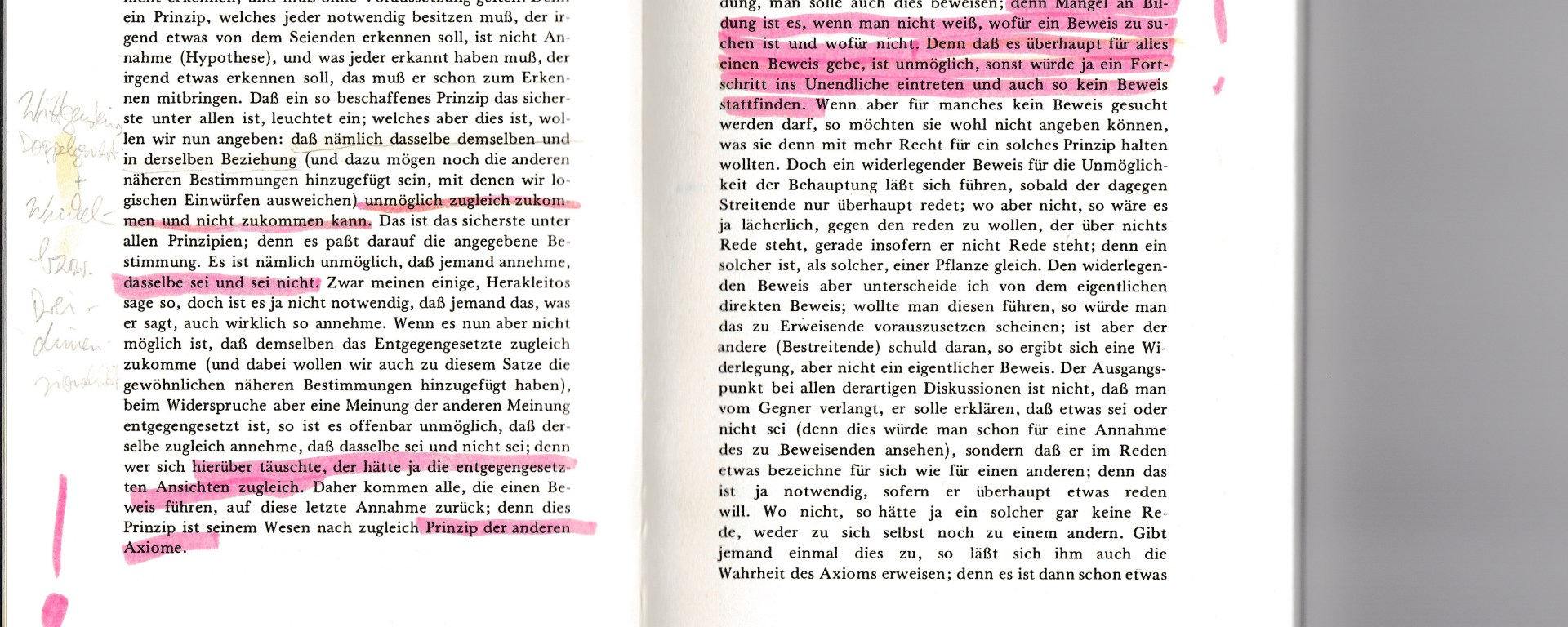 Aristoteles schreibt: „Daß ein so beschaffenes Prinzip das sicherste unter allen ist, leuchtet ein; welches aber dies ist, wollen wir nun angeben: daß nämlich dasselbe demselben und in derselben Beziehung (und dazu mögen noch die anderen näheren Bestimmungen hinzugefügt sein, mit denen wir logischen Einwürfen ausweichen) unmöglich zugleich zukommen und nicht zukommen kann. Das ist das sicherste unter allen Prinzipien; denn es paßt darauf die angegebene Bestimmung. Es ist nämlich unmöglich, daß jemand annehme, dasselbe ist und sei nicht.“[1]