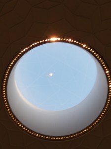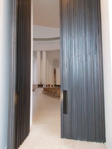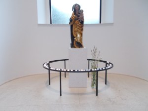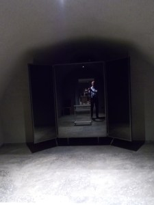 In der Krypta ein Triptychon aus Glasspiegeln, das den Betrachter in eine Marienfigur hinein spiegelt