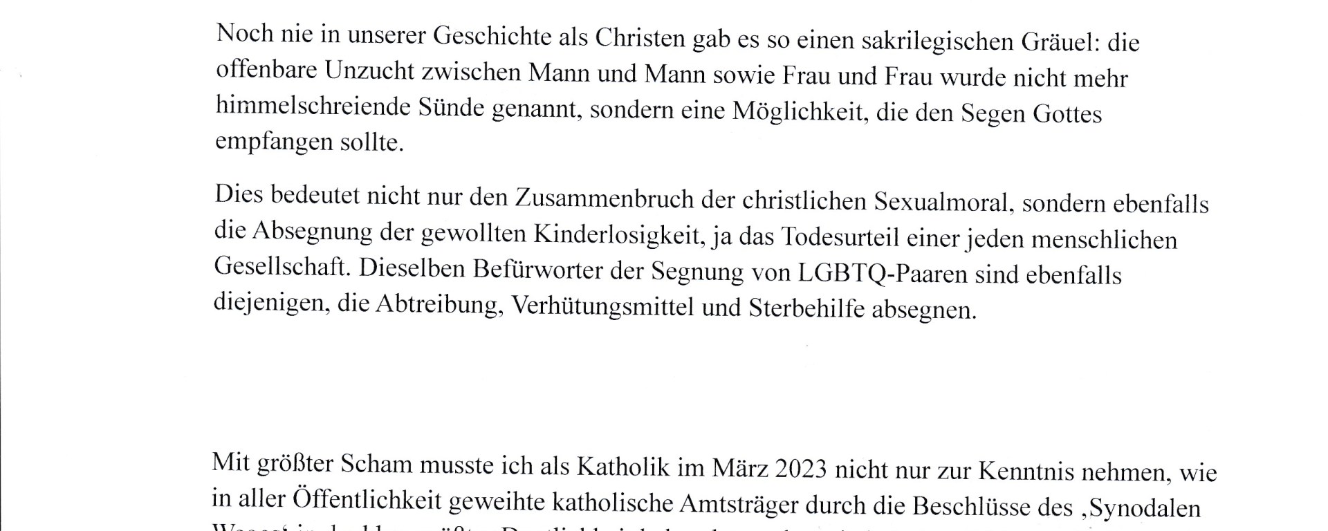 Dies bedeutet nicht nur den Zusammenbruch der christlichen Sexualmoral, sondern ebenfalls die Absegnung der gewollten Kinderlosigkeit, ja das Todesurteil einer jeden menschlichen Gesellschaft. Dieselben Befürworter der Segnung von LGBTQ-Paaren sind ebenfalls diejenigen, die Abtreibung, Verhütungsmittel und Sterbehilfe absegnen.
