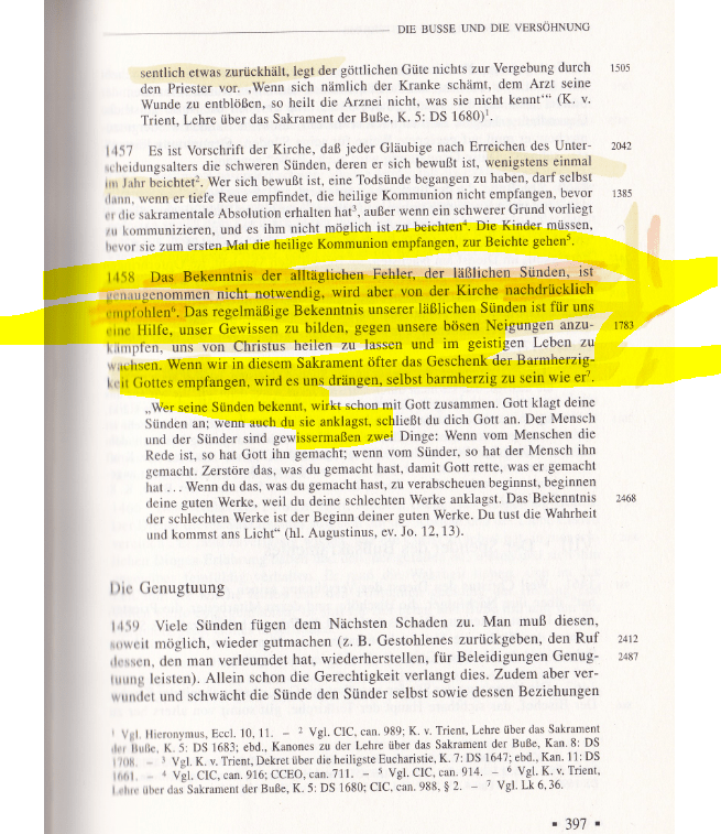 „Das Bekenntnis der alltäglichen Fehler, der läßlichen Sünden, ist genaugenommen nicht notwendig, wird aber von der Kirche nachdrücklich empfohlen [Vgl. K. v. Trient: DS 1680; [link] CIC, can. 988, § 2]. Das regelmäßige Bekenntnis unserer läßlichen Sünden ist für uns eine Hilfe, unser Gewissen zu bilden, gegen unsere bösen Neigungen anzukämpfen, uns von Christus heilen zu lassen und im geistigen Leben zu wachsen. Wenn wir in diesem Sakrament öfter das Geschenk der Barmherzigkeit Gottes empfangen, wird es uns drängen, selbst barmherzig zu sein wie er [Vgl. Lk 6,36.].“