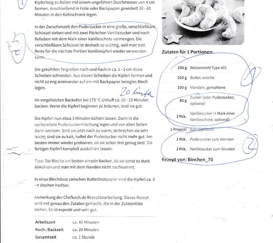 Gefunden bei Chefkoch.de Uromas Vanillekipferl – bestes Rezept! Berlin, 21.Dezember 2025 Zutaten 210g süße Butter 250g Weizenmehl Type 405 100g gemahlene Mandeln 80g Zucker 4 Packungen Vanillezucker 1 Packung Puderzucker Zubereitung 210g Butter auf Zimmertemperatur erwärmen und mit 250g Weizenmehl Type 405, 100g gemahlenen Mandeln, 80g Zucker und 2 Packungen Vanillezucker mit den Fingern vermengen Solange mit der Hand kneten, bis der Teig konsistent ist … Weltbeste Vanillekipferl weiterlesen