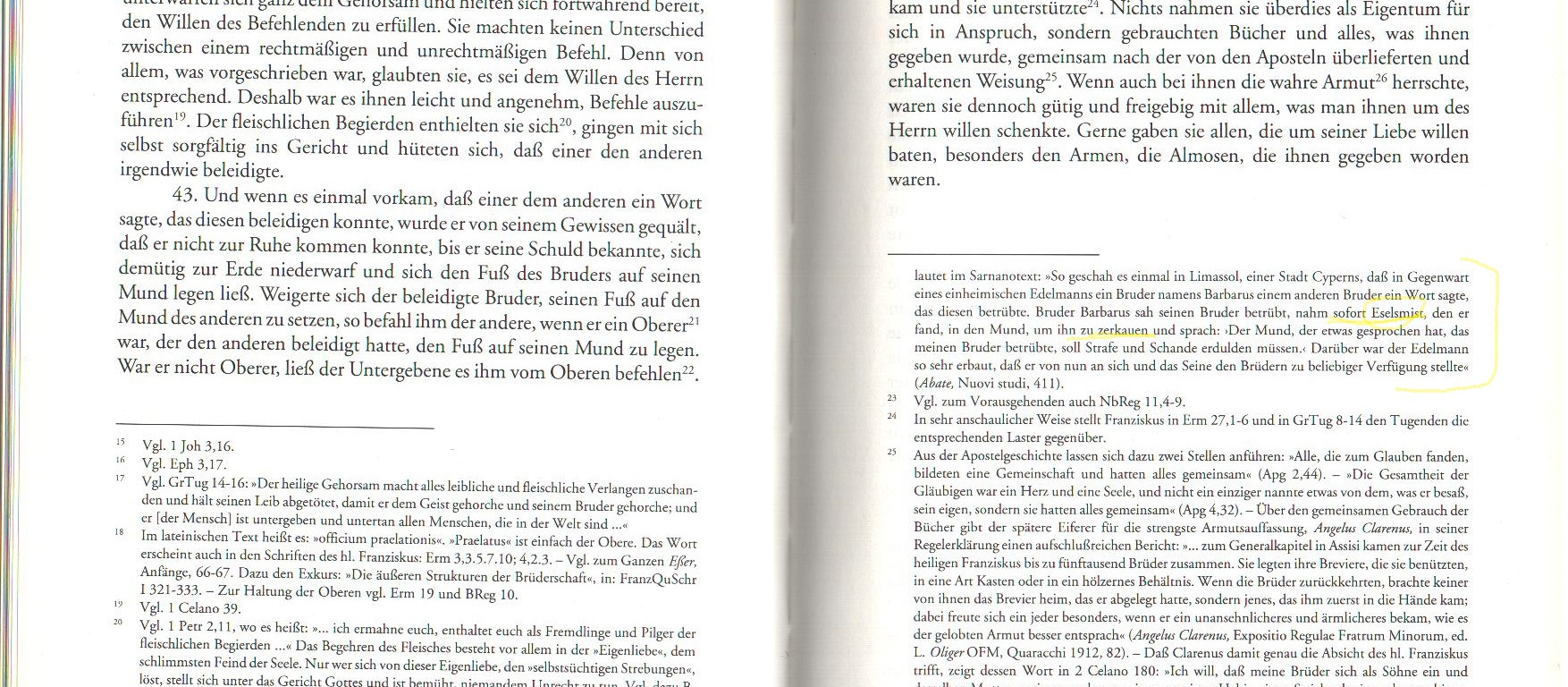 Und dann kam bei mir das große Nachdenken, als ich katholisch wurde. Denn mir fiel Gott sei Dank ein kleines Büchlein mit echten Sprüchen, Erlebnissen und den wenigen Dokumenten des authentischen Franziskus in die Hände (Herderbücherei Band 630): ‚Geliebte Armut‘.