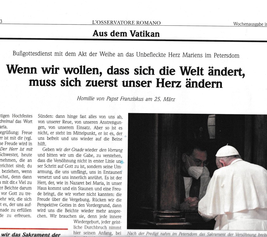Unser Heiliger Vater Franziskus nennt uns drei gute Gründe Berlin, 3.April 2022 Es ist Zeit für die Osterbeichte, zu der uns die heilige katholische Kirche einlädt. Es gehört zu den vornehmsten Pflichten eines Katholiken, wenigstens einmal im Jahr – am besten zur österlichen Zeit – zu beichten: so will es das zweite der fünf Kirchengebote.[1] Und der Heilige Vater in Rom lädt uns dazu ein, … Ermunterung zur Osterbeichte weiterlesen